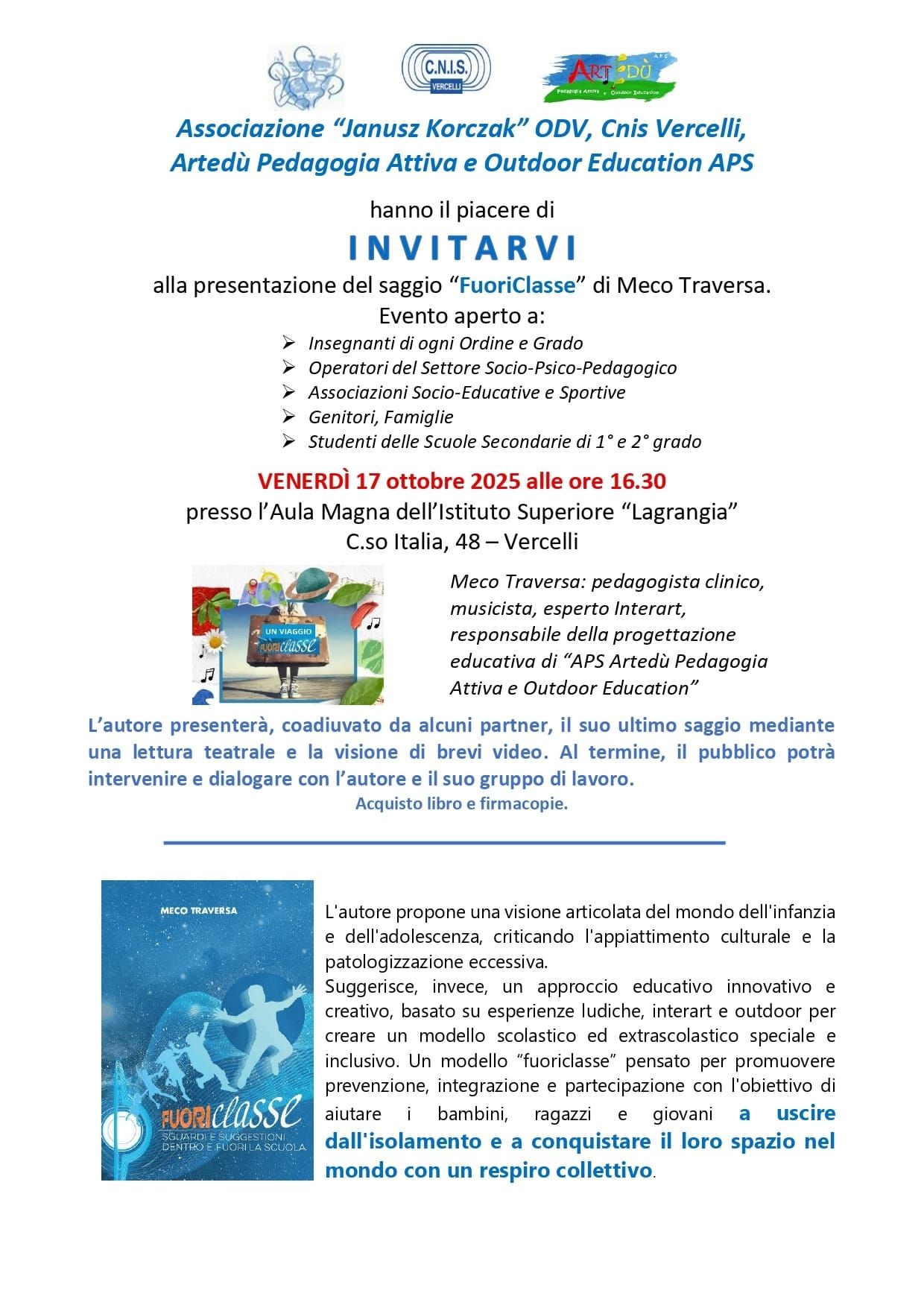 Artedù, Korczack e CNIS all' I.S. Lagrangia di Vercelli: tre Associazioni unite per presentare il saggio "FuoriClasse". Un incontro con l'autore che si è snodato tra teatro, visioni multimediali e dialoghi con il pubblico: una nuova impostazione, ideata e realizzata in collaborazione con Chiara Manachino e Melissa Martinotti con l'obiettivo di coinvolgere maggiormente il pubblico presente.